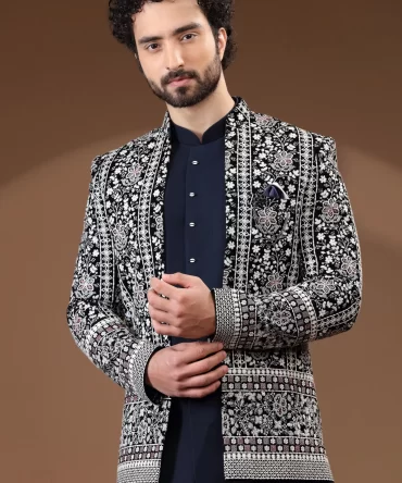 Black & White Rich Embroidered Navy Blue Jodhpuri Suit