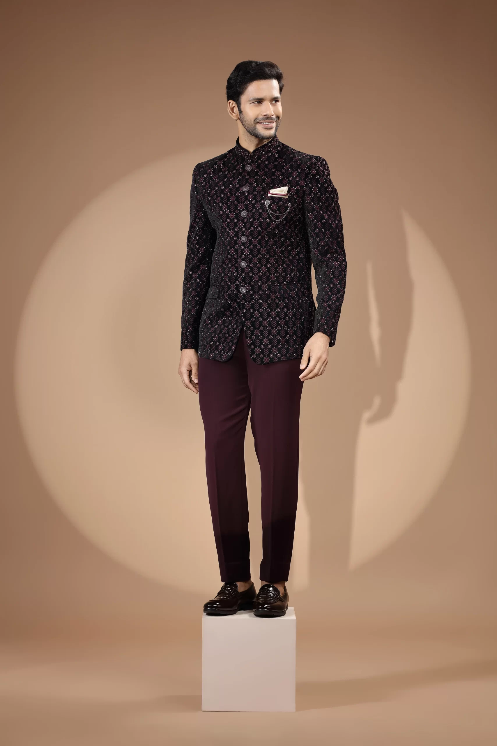 Our Black & Maroon Floral Thread Work Jodhpuri is the perfect pick for formal festivities and wedding ceremonies. The intricately self design gives a refined regal look for the occasion.