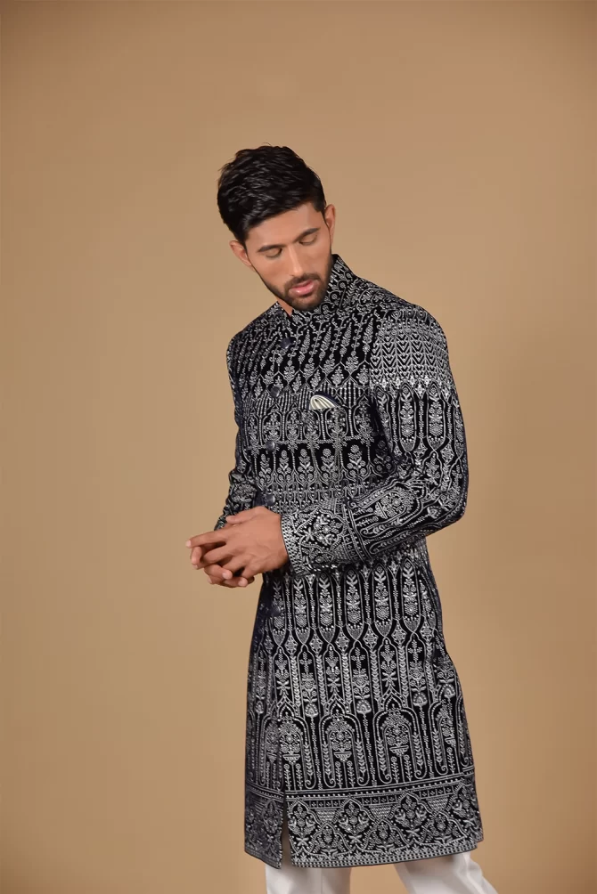 Make an edgy statement with our Black & White Velvet Indo Western designed thoughtfully for the modern Indian man. A fusion staple fit for every occasion, adds the right amount of cultural twist to the western silhouette.
