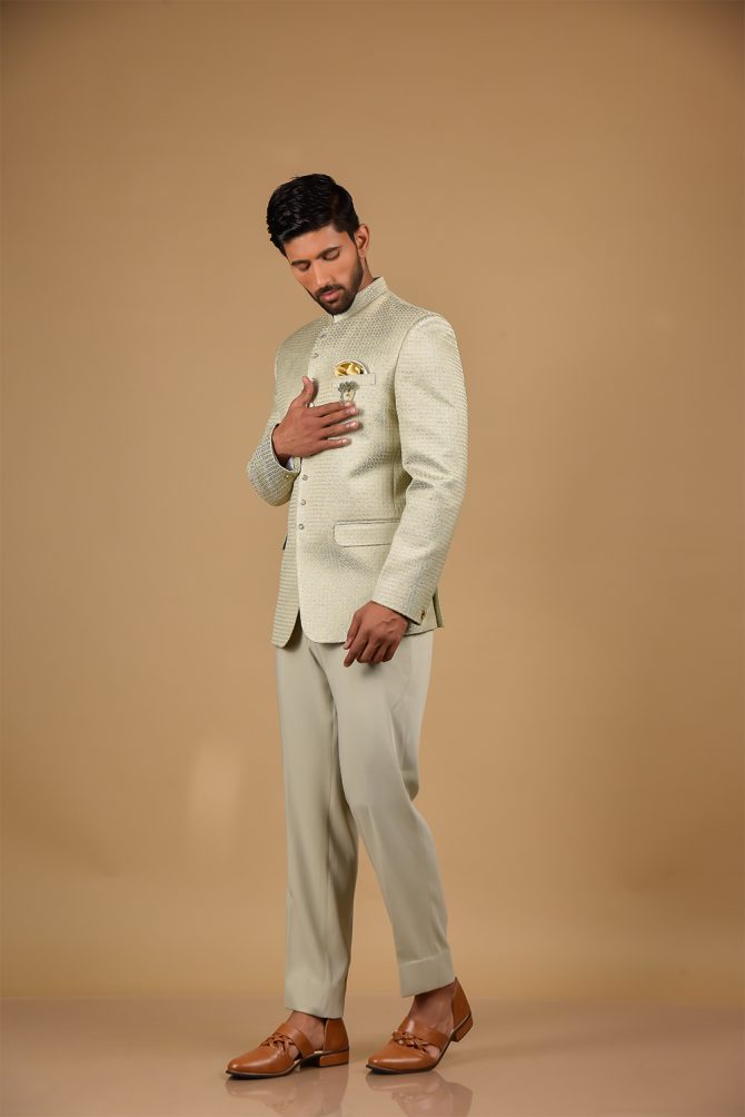 Our Glacial Green Thread Work Jodhpuri Suit is the perfect pick for formal festivities and wedding ceremonies. The intricately self design gives a refined regal look for the occasion.