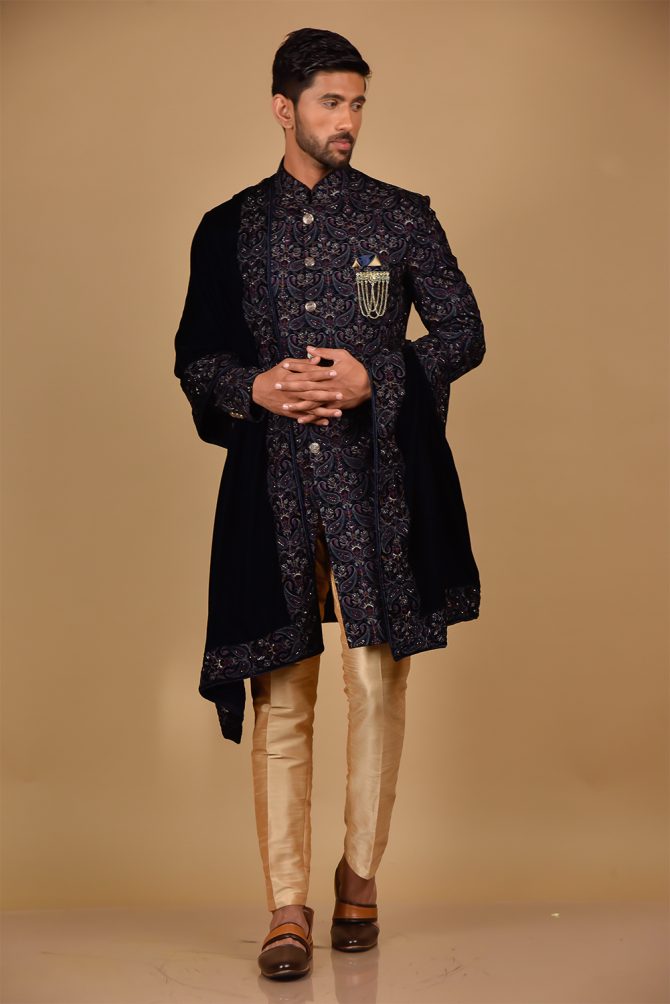 Make an edgy statement with our Golden Velvet Indo Western designed thoughtfully for the modern Indian man. A fusion staple fit for every occasion, adds the right amount of cultural twist to the western silhouette.