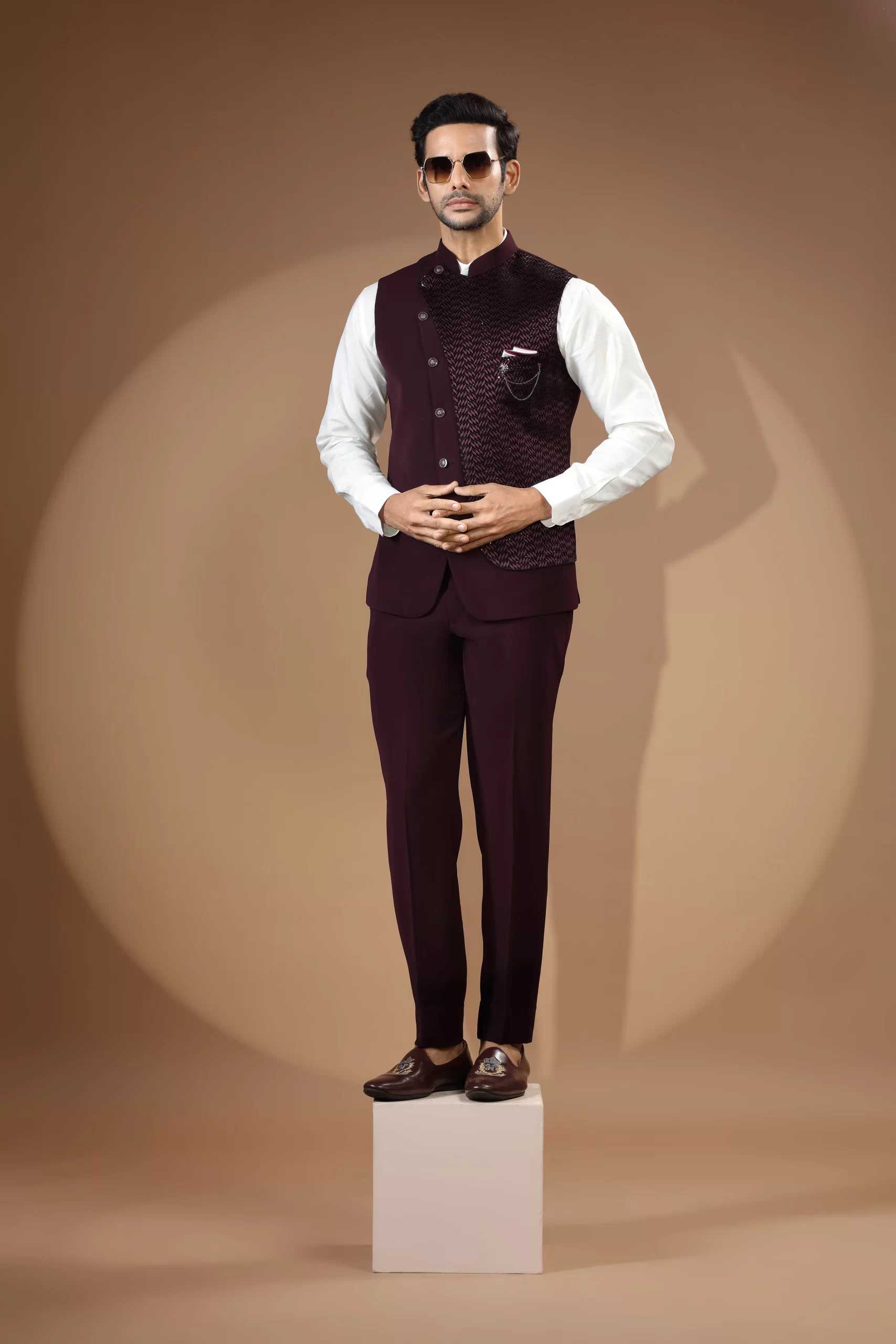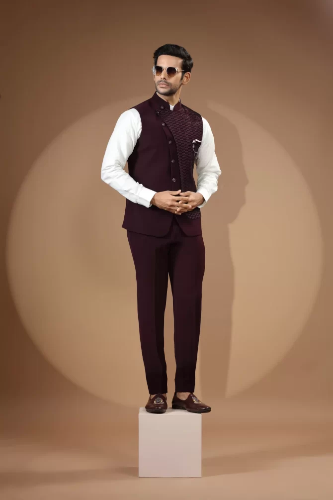 Make an edgy statement with our Maroon Velvet Waist-Coat Set designed thoughtfully for the modern Indian man. A fusion staple fit for every occasion, adds the right amount of cultural twist to the western silhouette.