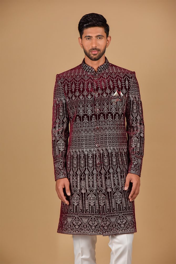 Make an edgy statement with our Maroon Velvet Indo Western designed thoughtfully for the modern Indian man. A fusion staple fit for every occasion, adds the right amount of cultural twist to the western silhouette.