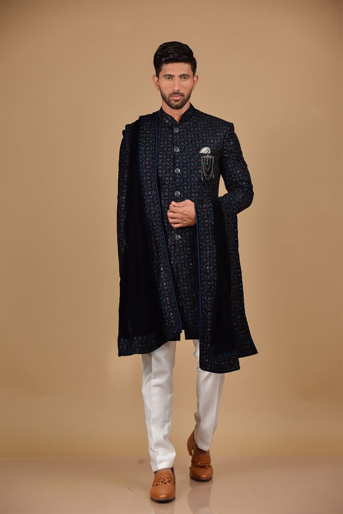 Make an edgy statement with our Navy Blue Velvet Indo Western designed thoughtfully for the modern Indian man. A fusion staple fit for every occasion, adds the right amount of cultural twist to the western silhouette.
