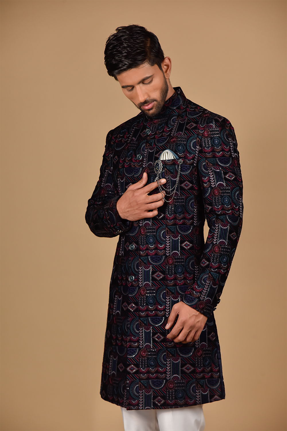 Make an edgy statement with our Navy Blue Velvet Indo Western designed thoughtfully for the modern Indian man. A fusion staple fit for every occasion, adds the right amount of cultural twist to the western silhouette.