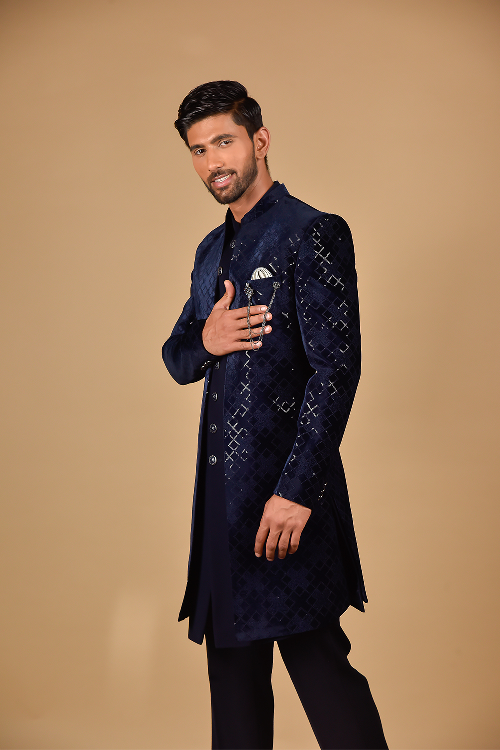 Make an edgy statement with our Royal Blue Velvet Indo Western designed thoughtfully for the modern Indian man. A fusion staple fit for every occasion, adds the right amount of cultural twist to the western silhouette.