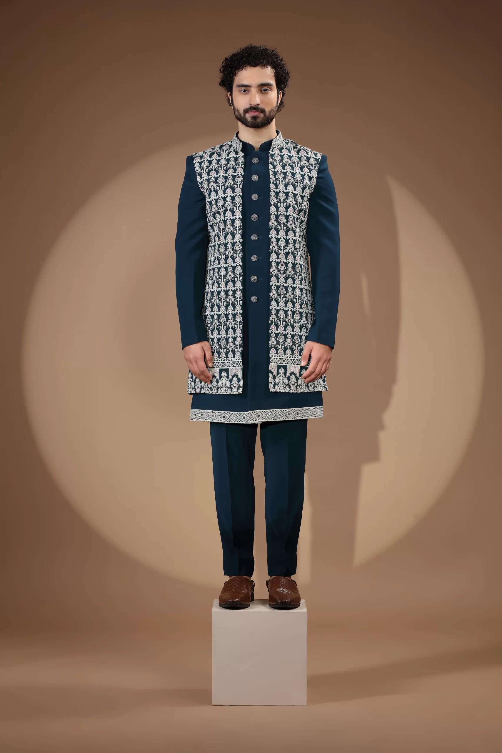 Make an edgy statement with our white & blue Velvet Indo Western designed thoughtfully for the modern Indian man. A fusion staple fit for every occasion, adds the right amount of cultural twist to the western silhouette.