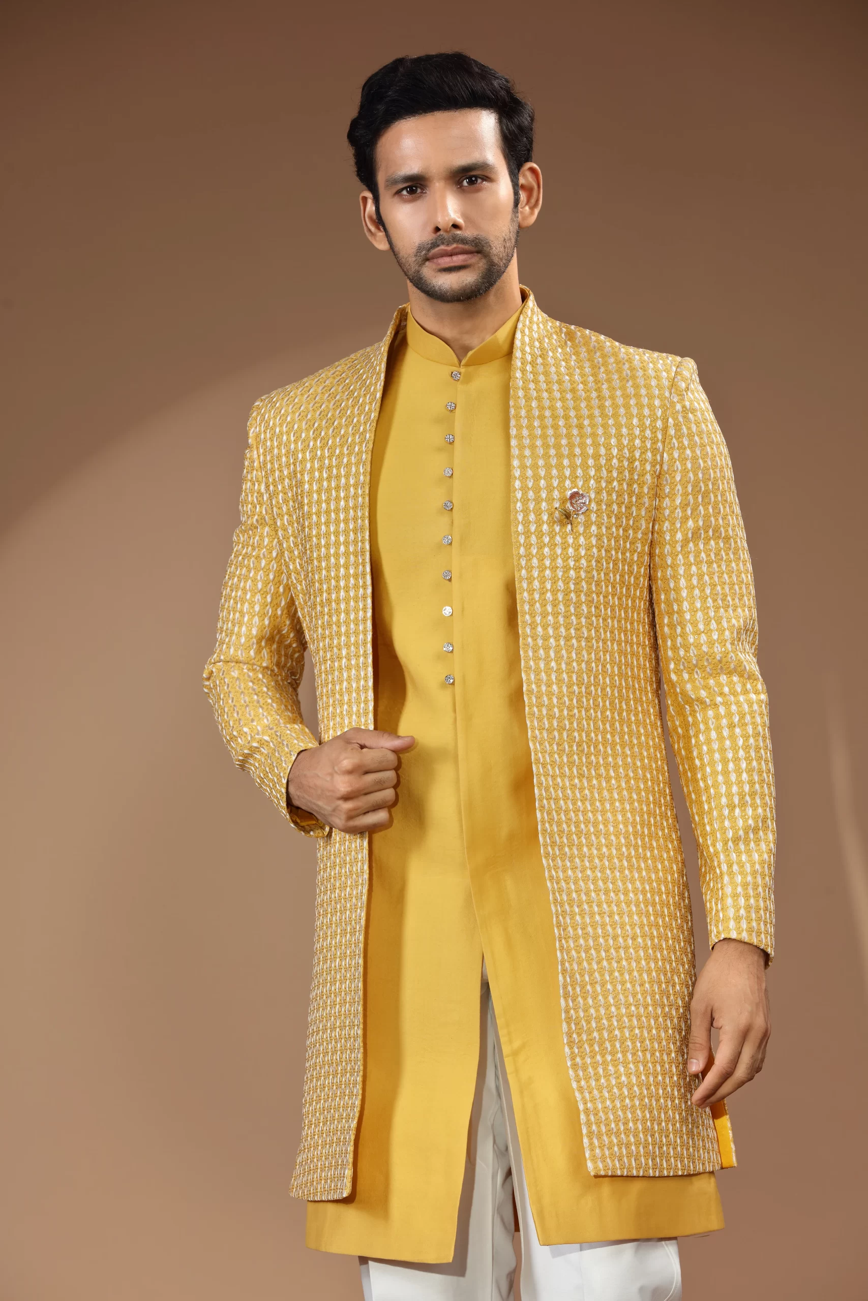 Make an edgy statement with our Yellow & White Velvet Indo Western designed thoughtfully for the modern Indian man. A fusion staple fit for every occasion, adds the right amount of cultural twist to the western silhouette.